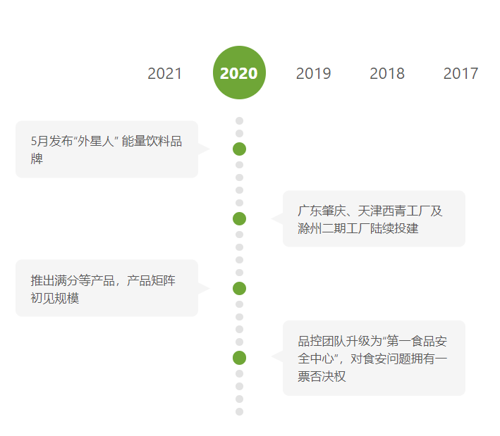 在元气森林官网,有一篇“元气大事记”。其中,品牌将2020年推出满分等产品,作为元气森林产品矩阵初见规模的标志。