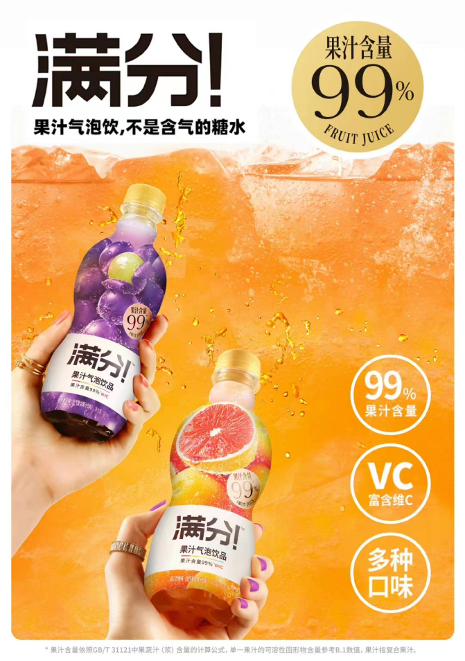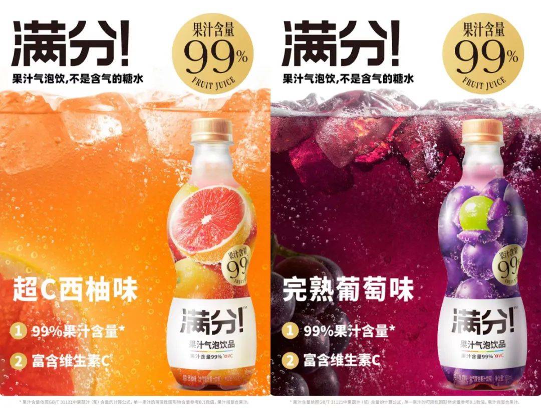 满分透露,以前的版本很多用户表示喝完一整瓶有压力,此次团队结合用户的反馈,在口味上做了调整,希望提供更合适的酸甜比,让消费者体验“果汁+气泡”饱满又清爽的独特口感。