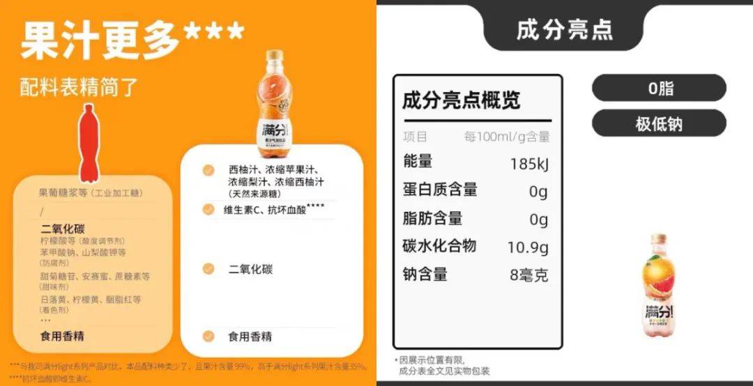 对此满分表示,调整还是基于元气森林一贯的“用户第一”的价值观。团队通过各种路径,对超过200位满分核心用户和目标用户进行了回访和追溯。满分发现真正打动用户、留下记忆点的还是满分的果汁含量——“喝起来就和别的汽水不一样”。因此放大了“果汁99%”和相关成分亮点。