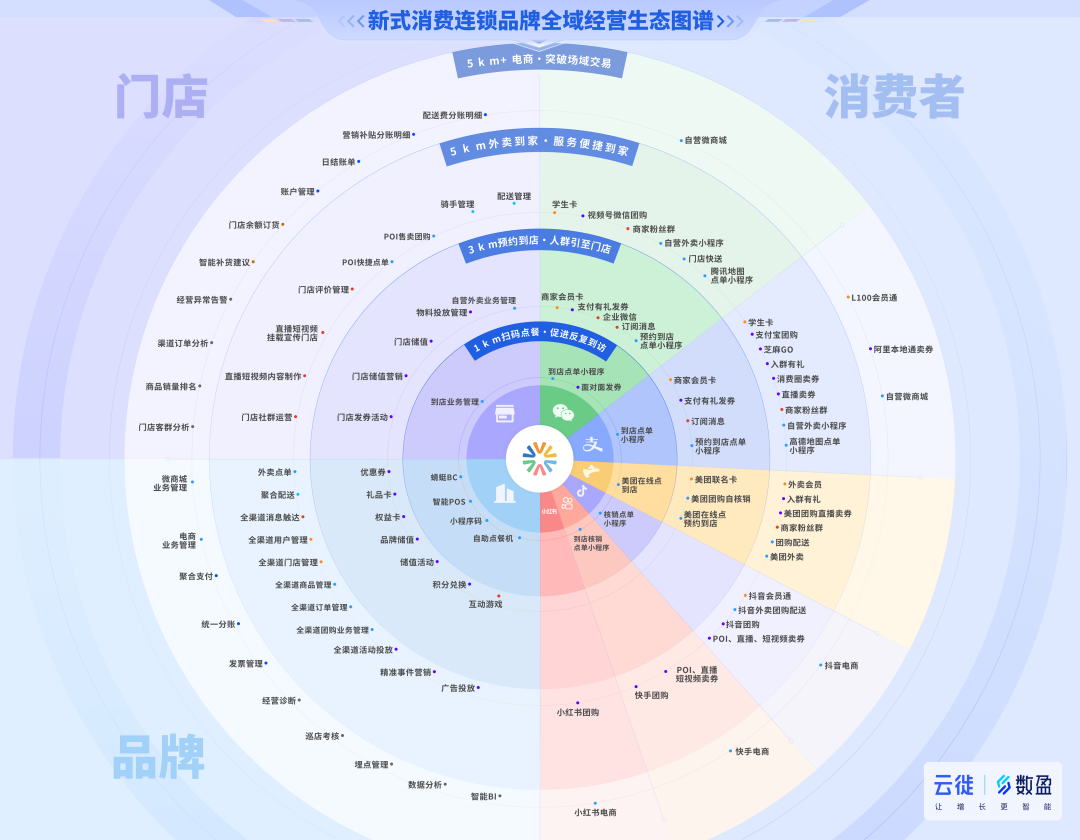 为了直观呈现生态变迁,在云徙数盈最新发布的这份全域经营生态图谱中,以用户与门店的服务半径作为评价指标,根据用户消费行为的典型特征,细化出1KM、1~3KM、3~5KM、5KM+四个射程范围,梳理各个生态的差异化运营策略与资源优势。