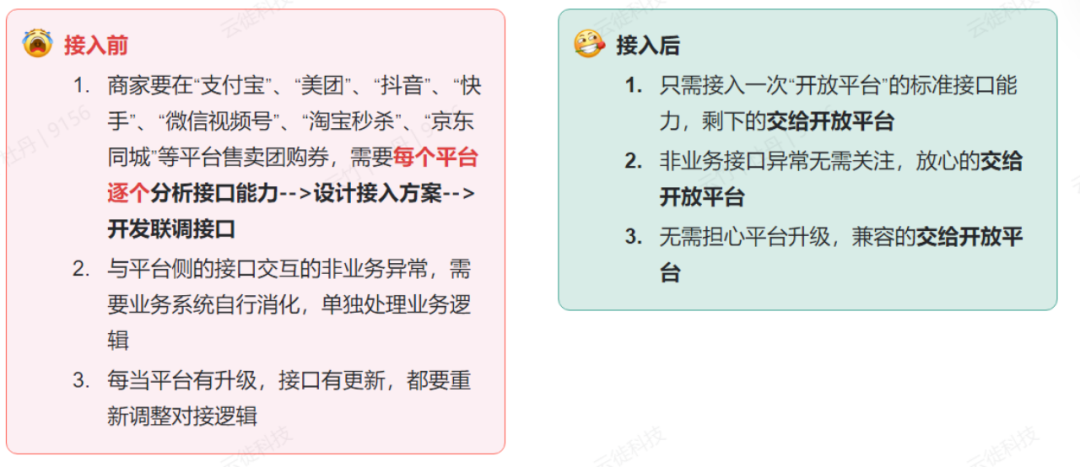 以当下热门的“本地⽣活团购”为例,开放平台现已打通微信、支付宝、美团、抖音、快手、等主流平台的本地生活团购业务,将“商品管理”“购买权益”“兑换权益”等流程,封装到⼀个应⽤包中,品牌商家仅需要⼀次接⼊,就可以与各个平台实现业务交互。