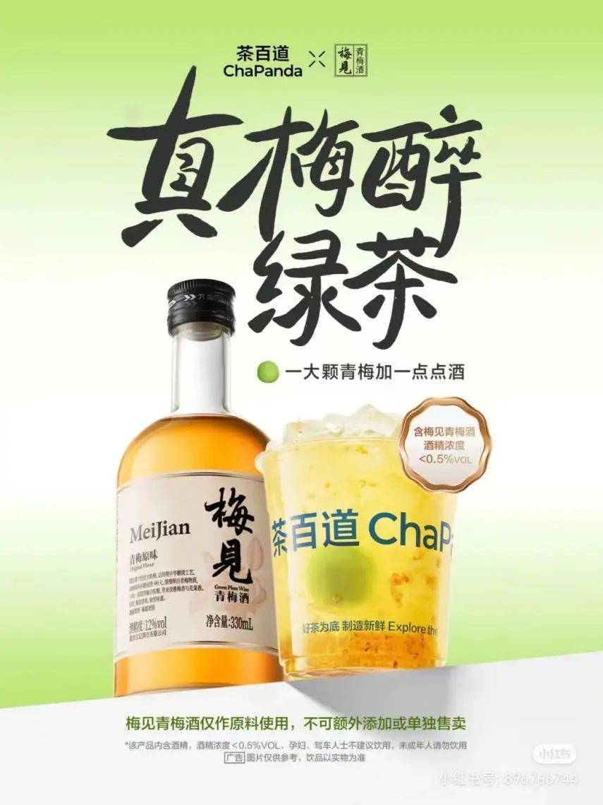 在2020年,茶百道与泸州老窖跨界推出“醉步上道”之后,“茶+酒”的搭配进入了更多茶饮门店。梅见最近也和茶百道官宣了新品:真梅醉绿茶。
