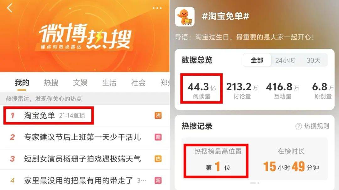 昨天上午,#淘宝免单#、#质子之争#等话题迅速登上微博热搜榜一,阅读量44.6亿,互动量和讨论量超过600万。