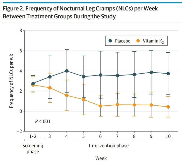 研究发现,在每周夜间腿部痉挛频率:维生素K2(MK-7)组从(2.60 [0.81])到0.96(1.41),而对照组从(2.71 [0.80])却维持在3.63 (2.20),维生素K2(MK-7)组与对照组(P < 0.001)有差异。