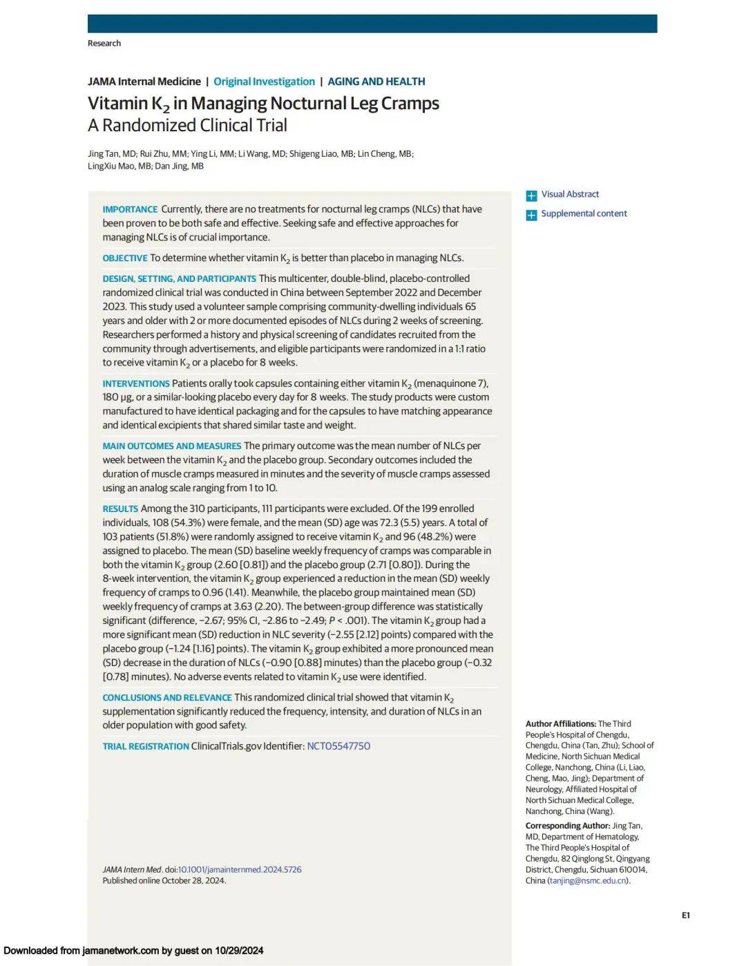 Jing Tan, Rui Zhu, Ying Li, Li Wang, Shigeng Liao, Lin Cheng, LingXiu Mao, Dan Jing.Vitamin K2 in Managing Nocturnal Leg Cramps: A Randomized Clinical Trial. JAMA Intern Med, 2024 Oct 28; doi: 10.1001/jamainternmed. 2024.5726. Online ahead of print.