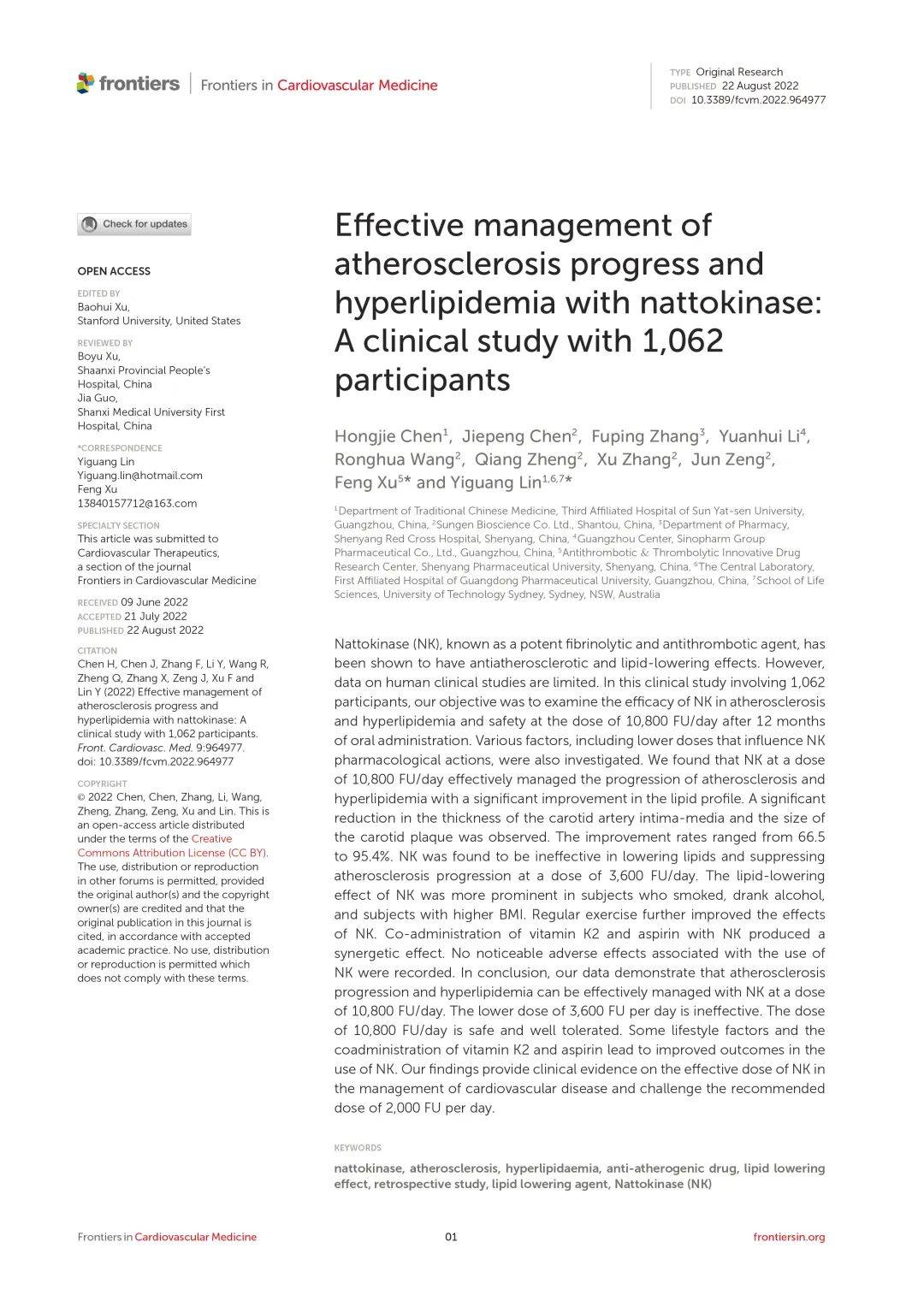 Chen H, Chen J, Zhang F, Li Y, Wang R,Zheng Q, Zhang X, Zeng J, Xu F and Lin Y (2022) Effective management of atherosclerosis progress and hyperlipidemia with nattokinase: A clinical study with 1,062 participants. Front. Cardiovasc. Med. 9:964977. doi: 10.3389/fcvm.2022.964977
