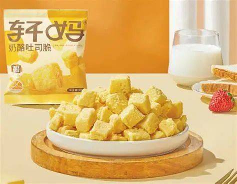 如轩妈推出的奶酪吐司脆,选用新西兰进口帕玛森干酪和切达芝士,特别加入安佳黄油和纯牛奶搅拌调和,保留了原制干酪浓郁咸香的同时也增添了芝士的柔和顺滑,嚼一嚼唇齿留香。