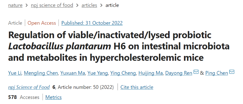 在2022年10月31日的研究中,来自吉林农业大学食品科学与工程学院功能性微生物资源开发与食品安全控制团队负责人任大勇教授等人发现,不同状态下(活性/灭活/裂解)的植物乳杆菌H6能够通过调节脂代谢相关的肠道菌群结构和代谢物来改善小鼠高胆固醇饮食引起的高胆固醇血症,研究成果发表在npj Science of Food 期刊。