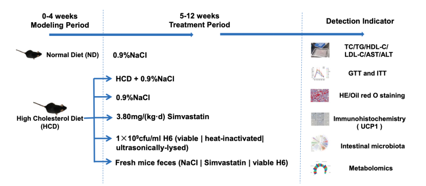 研究者李月博士介绍到,试验评价了活性、灭活、裂解的植物乳杆菌H6对高胆固醇血症小鼠的降胆固醇效果,通过分析H6对高胆固醇血症小鼠的粪便菌群及其代谢物的调节作用来阐述H6降胆固醇的作用机制。试验通过在高胆固醇模型建立成功后进行正常饮食,分别灌胃活性/灭活/裂解的植物乳杆菌H6,以灌胃生理盐水和辛伐他汀为阴性对照和阳性对照组,同时对活性菌进行粪菌移植。