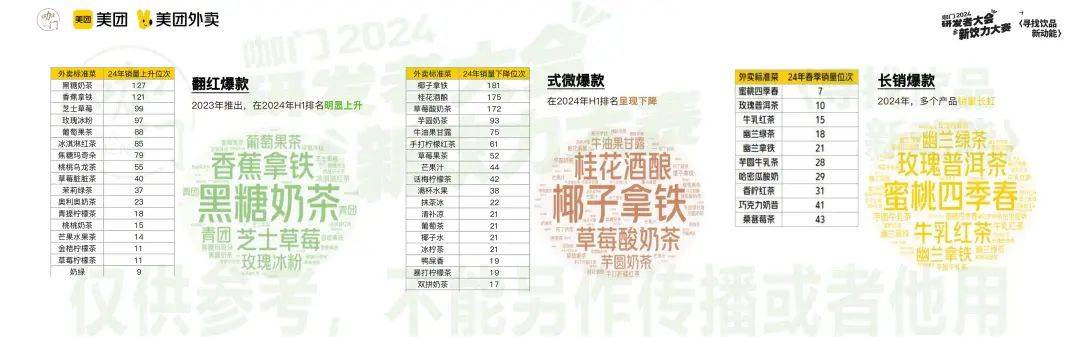 从美团外卖搜索和销售来看,上半年,黑糖奶茶、香蕉拿铁、芝士草莓,这3款产品去年就有,今年上半年的销量有显著提升。