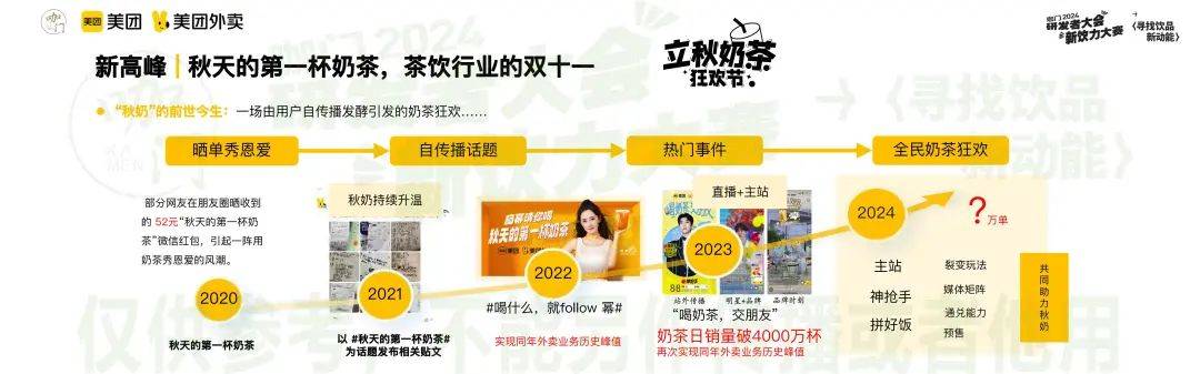 今年是“秋奶”的第5年,2022年平台已经入局,组织各个品牌一起做营销活动。在2023年,“秋奶”日销售的杯量已经超过4千万杯,并突破了美团外卖平台突破历史订单峰值。