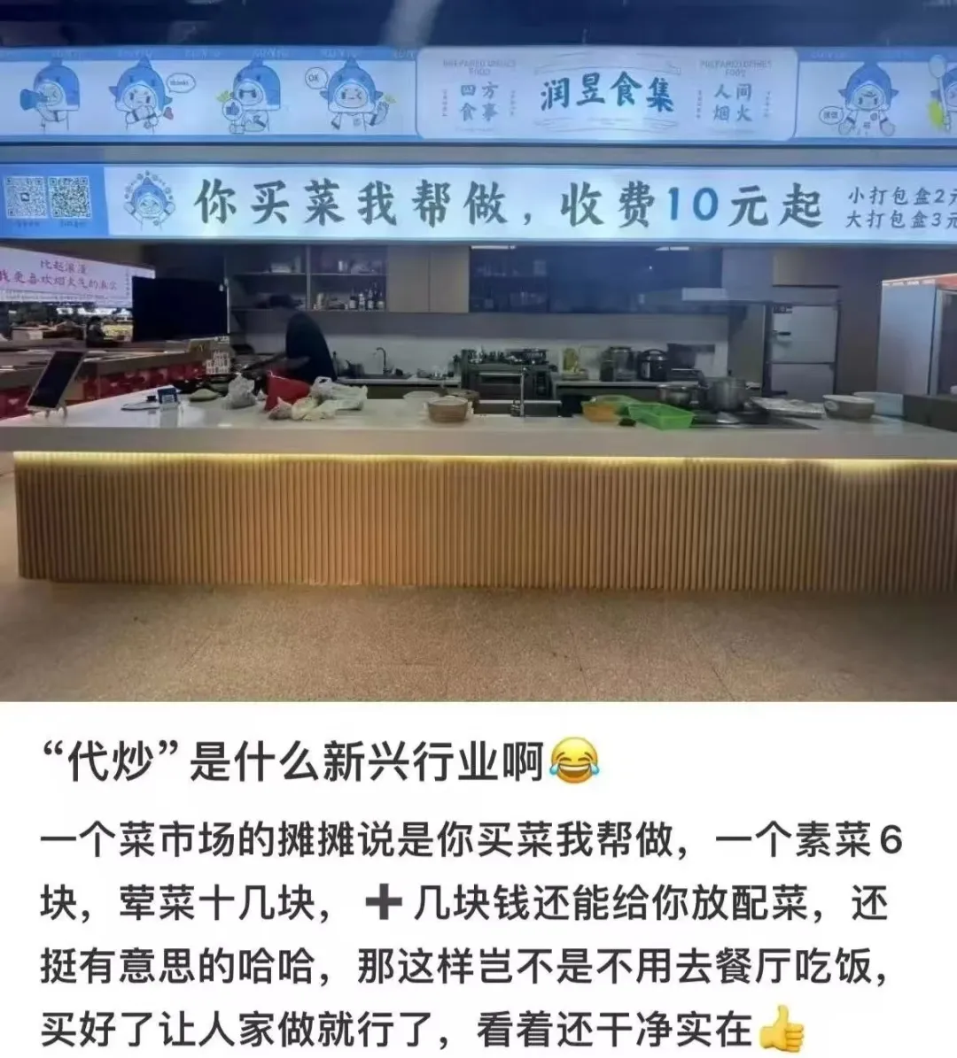 最近几天,一则10元代炒菜的新闻登上了热搜,有人说这是拯救“牛马”们的福利,是年轻人的外卖平替,是养生年轻人的yyds。据悉代炒菜业务意思是消费者只需要在市场购买食材,交给菜市场老板们就行了,连葱姜蒜,酱油盐味精都由老板提供。