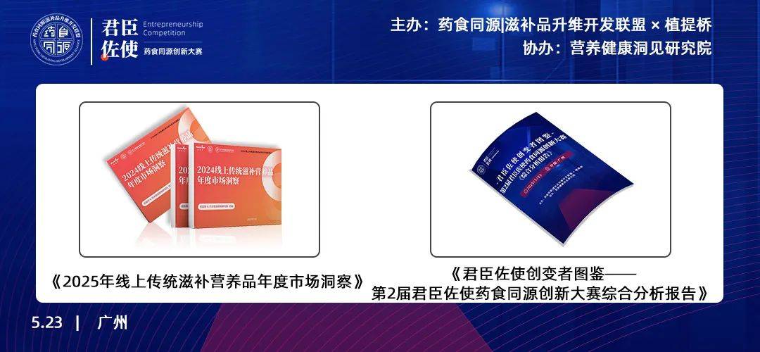 此外,现场还将推出《君臣佐使创变者图鉴——第2届君臣佐使药食同源创新大赛综合分析报告》,从市场化视角深度分析本届赛事项目的创新点、国内药食同源科学研究的热点方向,研究与市场的结合启发等。立足于专业独立视角,促进院校端研究项目亮点展示与下游商业化的启迪思考。