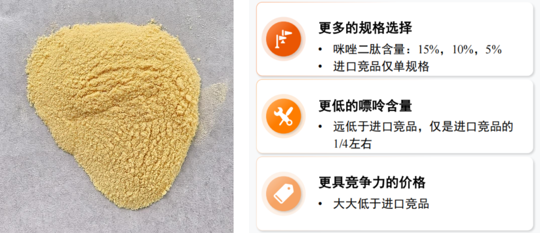 凭借自主提取富集与嘌呤脱除技术,攻克咪唑二肽含量低、嘌呤高、易吸潮等难题,达国际水平,推动行业发展,具创新与实用价值。