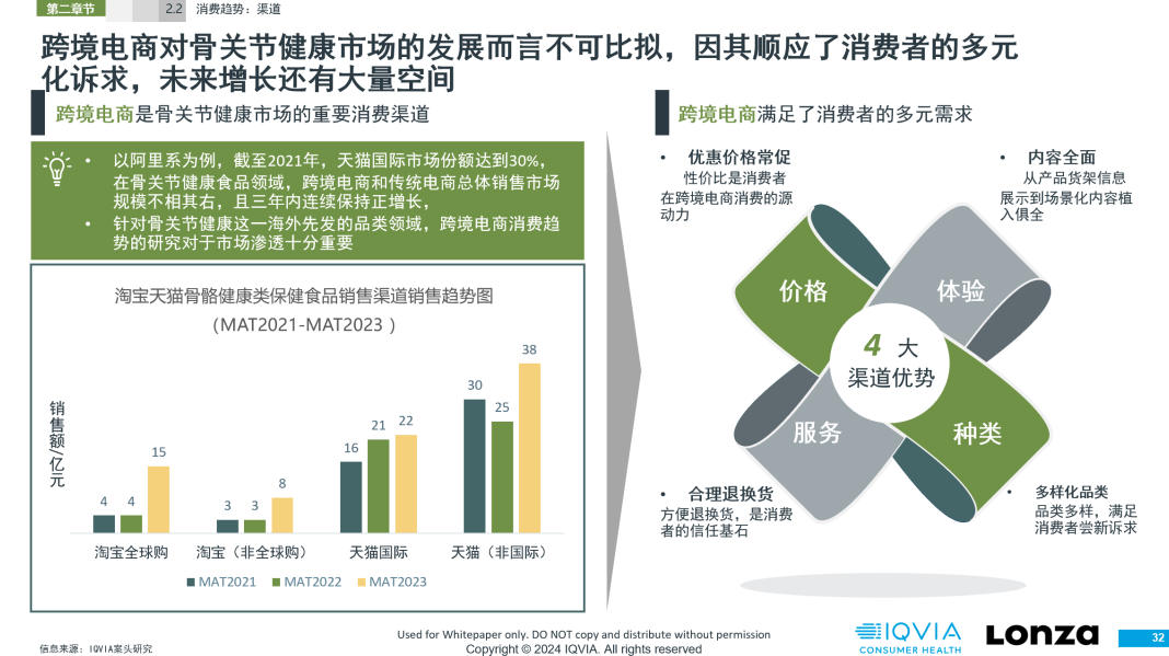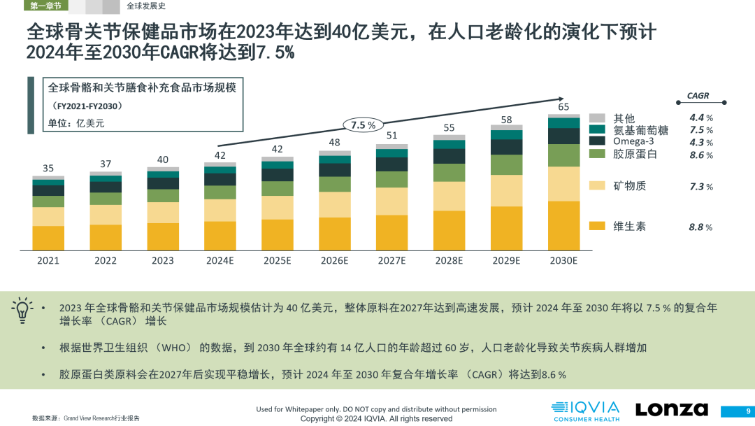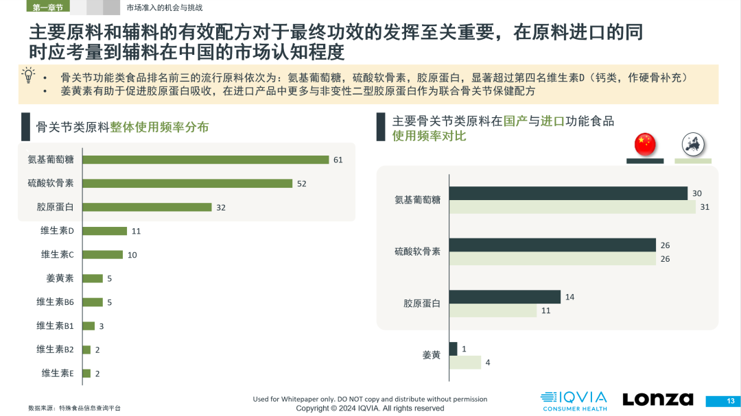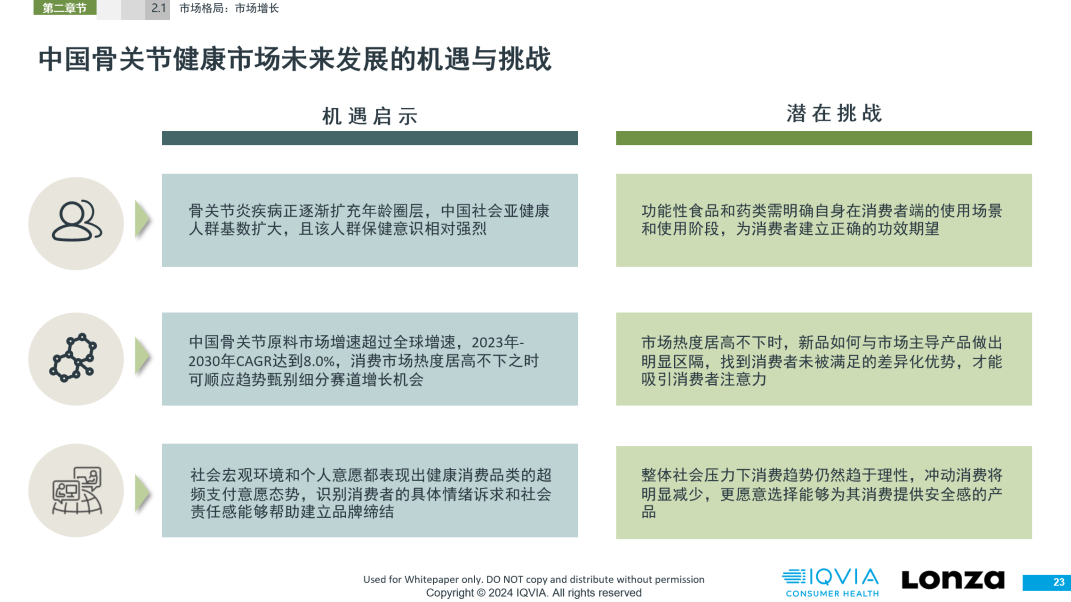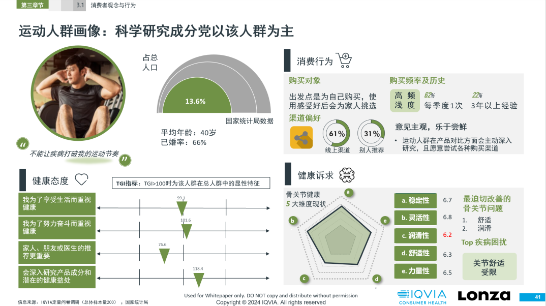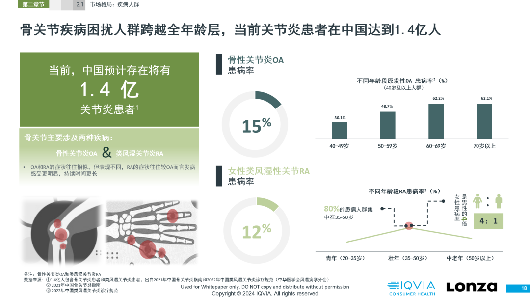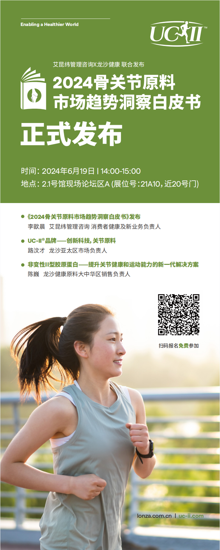 目前,我国预计有1.4亿骨关节炎患者,40岁以上人群每10人中就有将近5人受到骨关节炎困扰1。而骨关节炎患者就诊率仅为50%,从出现疼痛到确诊的时间长达2年,超过90%的患者在出现膝痛时才随诊2,3。我国骨关节炎每年的平均花费在8,000-10,000亿左右,超过国民生产总值的1%,是一笔非常大的医疗支出2,3。 基于此背景,龙沙集团(Lonza)与IQVIA艾昆纬将于6月19日在健康天然原料、食品配料中国展(Hi & Fi Asia-China)重磅推出《2024骨关节原料市场趋势洞察白皮书》(以下简称“白皮书”)。 我们结合多年行业研究、知名专家解读和广泛消费者调研结果,对骨关节原料发展机会、市场格局、消费者画像及消费趋势进行梳理。 白皮书主要亮点包括 亮点1 科学分析全球骨关节市场机遇 全球骨关节保健品市场在2023年达到40亿美元,预计2024年至2030年CAGR将达到7.5%。 亮点2 骨关节原料市场洞察 骨关节功能类食品排名前三的原料依次是:氨基葡萄糖,硫酸软骨素,胶原蛋白。占比最高的氨基葡萄糖已经流行比较久,软骨素常与氨糖联合使用,因此,市场端原料的同质化需要由新兴的原料进行升级和迭代。胶原蛋白制备技术一直在不断创新,非变性二型胶原蛋白是近年来发现对骨关节健康有多重干预效果的成分。 亮点3 购买渠道分析 跨境电商和传统电商规模相当,且三年内连续保持正增长。而跨境电商因内容全面、宣称上更灵活,满足了消费者多元需求。 亮点4 消费者人群细分 骨关节健康困扰人群主要集中在6大类:中老年人群、运动人群、白领人群、主妇人群、超重人群和孕妇人群。以运动人群为例,62%运动人群每季度购买1次,61%选择线上渠道,核心困扰的问题是关节舒适受限,最迫切想要改善的骨关节问题是舒适性和润滑度。 亮点5 未来发展的机遇和挑战 骨关节市场需求不断增加,且中国骨关节原料市场增速超过全球;市场热度居高不下时,新品如何做出差异化,且为消费者建立正确的功效预期以及实际改善,是企业方需要不断思考的问题。 以上图片来源:《2024骨关节原料市场趋势洞察白皮书》 想在白皮书发布现场一探究竟? 想最快拿到一手资料? 龙沙(Lonza)诚邀您来参加2024年6月19日-21日健康天然原料、食品配料中国展(Hi & Fi Asia-China),我们会在6月19日14:00在2.1号馆现场论坛区A重磅发布《2024骨关节原料市场趋势洞察白皮书》。 展会信息 展会名称:健康天然原料、食品配料中国展(Hi & Fi Asia-China) 展会时间:2024年6月19日-21日 展会地点:国家会展中心(上海) 龙沙展位:41D40 白皮书发布环节如下: 即刻扫码,完成2024 Hi & Fi Asia-China报名。我们诚挚邀请您亲临展会,与我们一同探索2024骨关节原料市场潜力和机会,并了解如何将龙沙的创新原料融入您的产品中,共同开拓健康市场新机遇。 参考文献: 1.《骨关节炎诊疗指南(2018版)》中华医学会骨科学分会 2.我国骨关节炎患者超一亿就诊率仅50% (https://med.sina.com/article_detail_103_1_67490.html ) 3.《2019-2025年中国骨关节炎药物行业市场研究报告》盛世华研 4. 李辉才.骨关节疾病患者中医怎么治疗才好?世界复合医学. 2021.Vol.6 5. Harris et al. (2021). Functional characterization of undenatured type II collagen supplements: Are they interchangeable? J Dietary Suppl. Online ahead of print. doi: 10.1080/19390211.2021.1931621 6.中华医学会骨科学分会关节外科学组.中国骨关节炎诊疗指南(2021年版).中华骨科杂志.2021,41(18):1291-1314 关于龙沙 龙沙是全球制药、生物技术与营养市场的优秀合作伙伴。我们致力于助力客户推出创新药物辅助治疗一系列的疾病,成就更健康的世界。为达成这一使命,我们将先进生产制造、科学专业技术、卓越工艺及技术洞察力完美结合。为满足客户复杂的需求,我们的业务按四大板块划分为生物技术、小分子、细胞与基因、胶囊与健康原料。我们全方位的产品与服务帮助客户在医疗保健行业的发现与创新成果实现商业化。 1897年,龙沙诞生于瑞士的阿尔卑斯山脉地区。发展至今,业务已遍及全球五大洲。我们拥有约17,500名全职员工,由他们组成的高效团队及每一名员工都为我们的业务和所在地区及国家做出意义非凡的改变。2022年,公司销售额达62亿瑞士法郎,核心业务的息税折旧摊销前利润(EBITDA)达20亿瑞士法郎。更多详情,请访问 www.lonza.com
