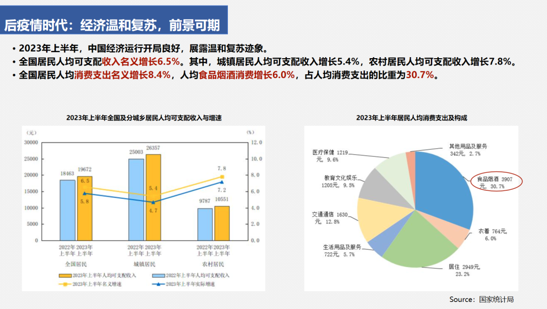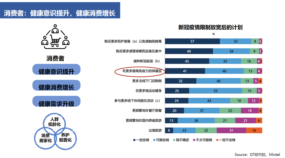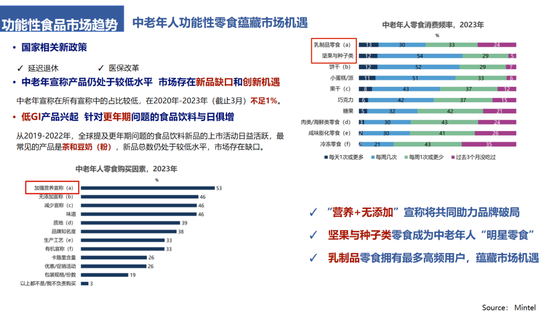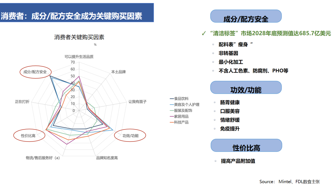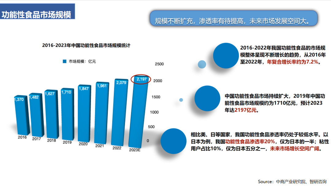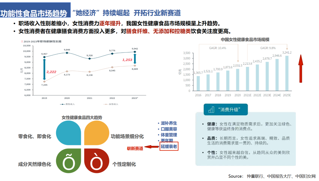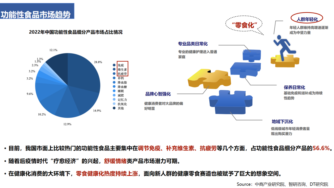2023年上半年,中国经济运行开局良好,战略温和复苏的迹象。但从消费市场来看,疫情对于消费习惯和消费场景的潜移默化影响是从放开后显露的。消费者大大降低了从传统市场购买的频率,消费场景变化背后是消费习惯与理念的转变。 大家对于消费的需求不降反增。这有两个方面的原因,一是现金流意识增加了可支配收入的比重,二是健康悦己的诉求令消费者愿意为更好的体验买单。国家统计局数据显示,全国居民人均可支配收入名义增长6.5%。其中,城镇居民人均可支配收入增长5.4%,农村居民人均可支配收入增长7.8%。在消费支出上增长8.4%,食品烟酒消费增长6%,占据了人均消费支出比重的30.7%。 其中,中产阶级成为推动消费增长的主力军。数据显示,2019年至2021年间,年收入超过16万元人民币的中国城镇家庭数的年复合增长率达18%,预计到2025年将有7100万家庭进入这一较高收入区间,新中产阶级继续壮大,中国消费市场潜力巨大。 新中产阶级的消费观,以品牌高端化、品牌本土化及品牌个性化为核心。然不确定因素增加的局限下,其消费也相对保守。相比于8元以上的产品销量,3-5元的饮料更受青睐;以往消费者倾向于基于个性尝试的舶来品,现阶段也会考虑经济实惠类产品;中间位的产品更易被选择,旺旺品牌抓住机会获得了10%的增长。 这样的消费习惯也影响了快消品市场,去年底压力较大,今年初有所回暖,3-6月稍微回退,而7月又处于上升期。这种不稳健的态势下,优化成本、把握家外消费复苏先机、整合渠道战略以及密切关注消费者需求变化成为品牌布局时的方向点。 陈俊江认为,从长远来看,消费仍将成为中国经济发展的中流砥柱。根据Mintel中国消费支出总额预测,我国消费支出将继续增长,2023-2027年年均复合增长率为5.8%。从2023年的消费数据来看,25-29岁、50-59岁以及高收入家庭更渴望增加消费,其中朋克养生、老年保健和高端服务是消费需求最为旺盛的方向。 消费者信息总体乐观,线上消费信任度明显增加,“消费升级”成新趋势。2023年消费维权年主题调查显示,78.4%的受访者对未来一年本地区经济发展状况有信心,77.9%的认为未来一年消费环境状况将变好,公众信心总体乐观,且较2022年情况有所提升。 在“消费升级”方面,集中在“基础免疫、心理健康、医学科普”健康话题,但高低线城市出现了分化。由于紧绷的生活节奏及更大的生活压力,高线级城市侧重解决亚健康问题;低线级城市,则期待解决渠道、物流问题,以缓解基本医患科普缺失、购物渠道和物流不够便捷的问题。这一现象源于消费者健康意识的提升,人们“吃更多提高免疫力的保健品”的朴实计划催生了健康消费的增长。 在健康消费方面,成分、配方安全成为消费者购买的关键因素。消费者的购买越发理性,冲动消费明显减少,关注产品的功效功能,同时关注性价比。因而,配料简单且显著标注成为品牌发展的方向,通过消除信息差令消费者了解从而获得信任。 这种消费选择可以囊括为三个词:消费不降级、选择更明智、诉求多元化。从消费理念上,从节俭、盲从、炫耀,转变为主动、个性、健康、多元的消费主张;从消费需求上,从满足生理、基本生活所需,转变为满足品质、体验的情感层诉求;从消费渠道上,消费方式由线下、实体为主,转变为线上线下深度融合的趋势;消费结构上,由生存型的物质消费,转为发展型、享受型、疗愈型的消费。 我国功能性食品产业发展有着强有力的政策支撑,2017年至今有7个政策文件提及功能性食品发展,涉及食品工业发展、外商投资产业指导、药材、农业及乡村产业发展、轻工业发展、十四五规划等领域。 “积极开发营养健康的功能性食品,适应市场和消费升级需求”,可见功能性食品发展未来可期,加速推进功能性食品产业链建设是政策导向。这背后,是规模不断扩充、渗透率有待提高的功能性食品市场现状。 我国功能性食品发展较国际虽处于较低水平,但日常化的趋势明显。目前,我国市面上热门的功能性食品主要集中在调节免疫、补充维生素、抗疲劳等几个方面,占功能性食品细分产品的56.6%。伴随着疗愈经济的兴盛,舒缓情绪类产品将有较大的发展空间。 年轻人群成为消费的主力军,零食健康化热度持续上涨,核心是健康消费理念的加持。这种理念,延伸至儿童、女性和中老年群体,有着不同的侧重。 儿童零食方面,自然性和安全性的健康要素,免疫力和眼部健康的功能需求成为主流。一方面,国家政策高度重视给予政策支持,从政策层面关注儿童营养健康问题;另一方面,因疫情期间国外产品供应放缓,家长们对于不再盲目追求国外品牌,更侧重产品的成分与口碑,优质国产品牌纳入选择范围。因而,零食功能性宣称成为浪潮。2022年在中国推出的儿童食品饮料中,近40%带有某些功能性宣称,儿童零食巧妙搭乘功能性宣称的浪潮。 女性健康食品呈现了四大趋势:零食化、即食化、功能场景细分化、个性定制化机及成分天然绿色化。这与女性体重控制、皮肤保养的诉求密切相关,有效带动了针对女性健康相关的原料生产,以解决诸如经前综合症(PMS)、生育支持、更年期综合症、保持末梢体温及缓解女性夜间腿部肿胀等诉求。 食研汇FTA预测,中国口服美容行业市场规模在2021年-2025年将以3.3%的年复合增速稳定增长,预计2025年规模将增加至255.7亿元。这背后,