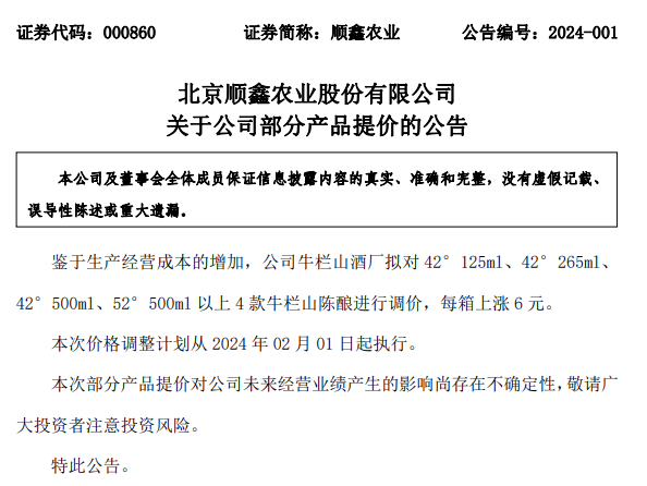 据顺鑫农业公告称,鉴于生产经营成本的增加,顺鑫农业牛栏山酒厂拟对42度125ml、42度265ml、42度500ml、52度500ml以上4款牛栏山陈酿进行调价,每箱上涨6元。本次价格调整计划从2024年2月1日起执行。