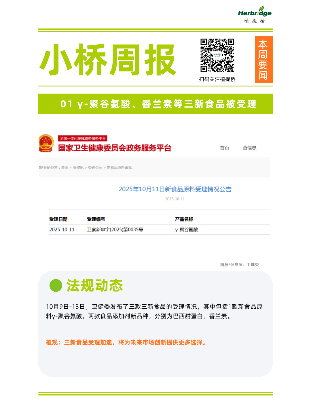 1、γ-聚谷氨酸、香兰素等三新食品被受理
