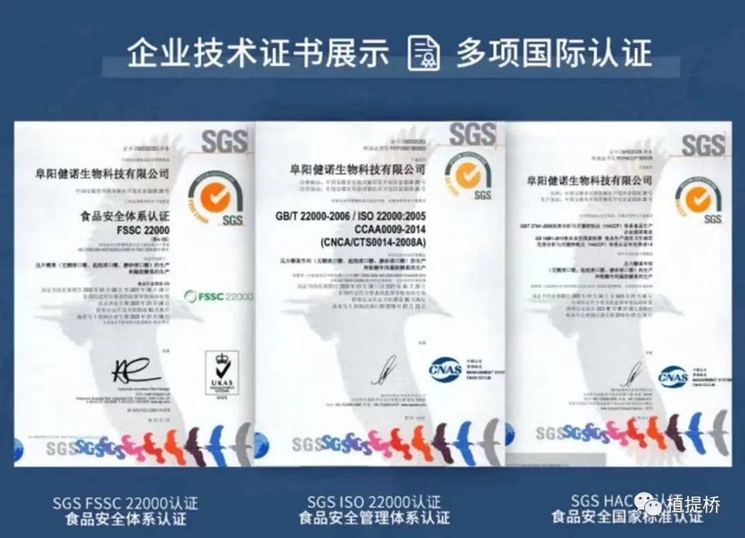 第三,企业资质。健诺生物获得了SGS认证机构认证ISO22000⻝品安全管理体系认证、FSSC22000⻝品安全体系认证、HACCP认证及美国FDA注册。