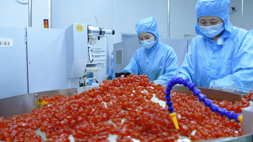 在设备方面,健诺生物拥有全自动的软糖生产线以及国内第一个备案制保健食品车间。其中软糖干燥间采取转轮除湿加冷暖双控配合罗盖特专业软糖模具淀粉,干燥效率高脱粉干净,呈现软糖产品优质的光泽度和口感完全媲美日韩同类产品。
