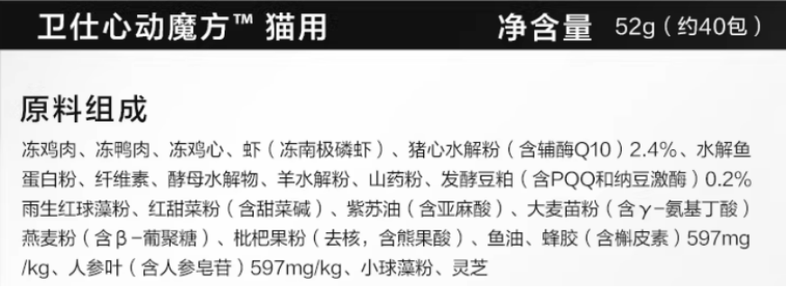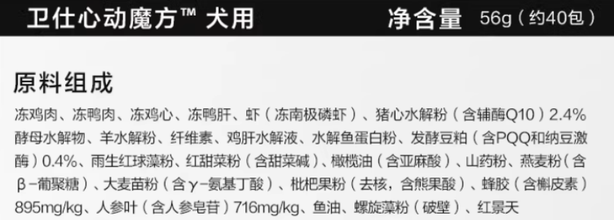 除了辅酶Q10 这一核心,卫仕心动魔方冻干还融入了多款人用营养领域的经典科技原料,实现“单一功效向综合防护”的升级,贴合宠物心脏健康的多维需求。