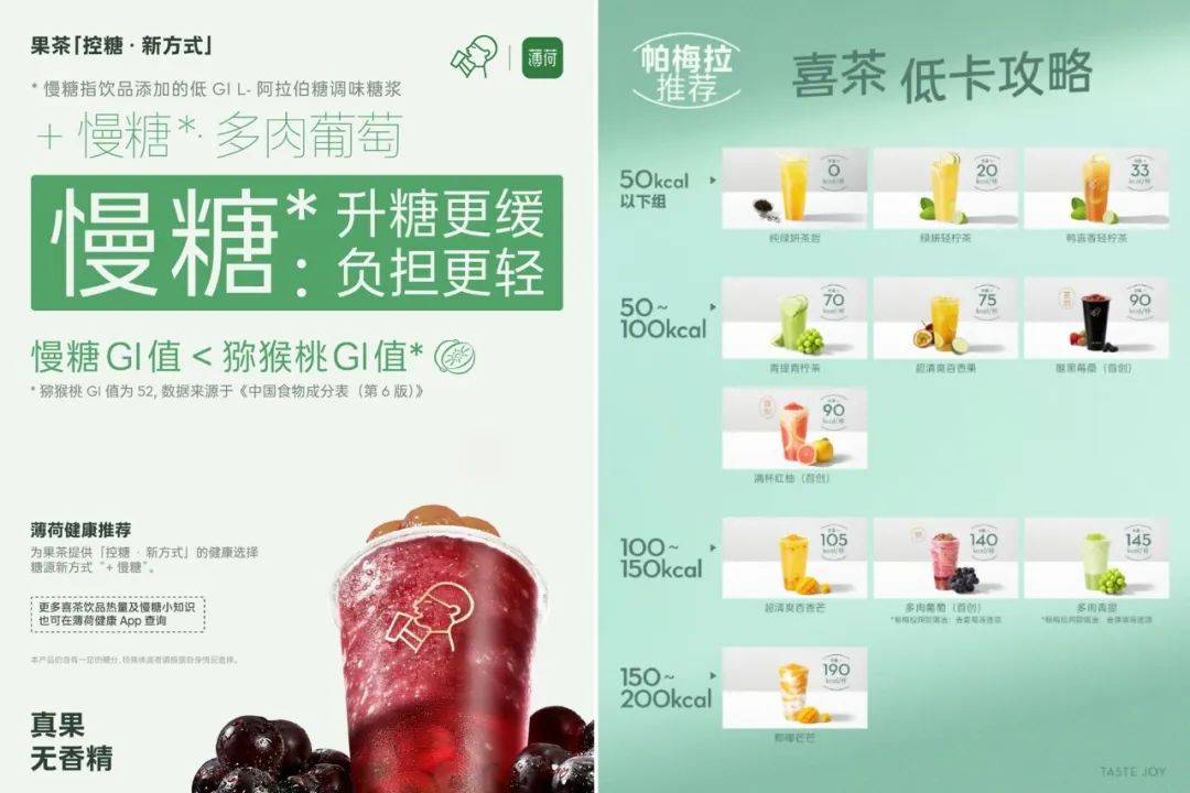 6月3日,喜茶联合薄荷健康上新轻负担饮品:+慢糖·多肉葡萄,通过低GI“慢糖”打造“果茶·控糖新方式”,瞬间吸引了行业和消费者的注意力。