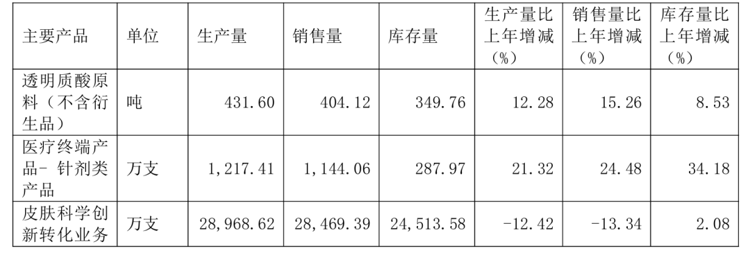 从生产量与销售量来看,皮肤科学创新转化业务2024年的产能已经进行了调整,相较于上年生产量减少了12.42%,但现实更为残酷,其2024年销售量比上一年减少了13.34%。