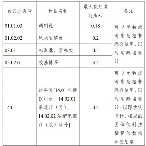 甜菊糖苷(酶转化法)用量和使用范围