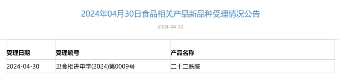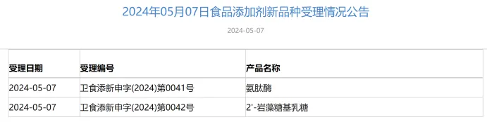 近一周以来,卫健委的“三新食品”的受理情况又有了新动态,包括3款食品添加剂新品种,分别是4月30日受理的甜菊糖苷,5月7日受理的氨肽酶和2'-岩藻糖基乳糖;以及1款和食品相关的新品种,二十二酰胺。