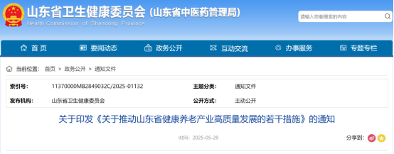 2025年5月29日,山东省卫生健康委员会等18部门联合印发《关于推动山东省健康养老产业高质量发展的若干措施》(以下简称《措施》),提出了一系列促进养老产业发展的新政策。