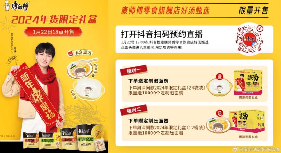 热门话题之下,康师傅的一系列营销活动更是让新品声量再上一层楼:在@康师傅老母鸡汤面官博发起的好汤面打CALL投票、盖楼、抽奖等定制活动,带动了数万人参与互动;冬至、腊八、大雪等重要节点,官方发布代言人物料,打造吃面喝汤场景,驱散深冬里的寒意;春节将至,康师傅好汤面在抖音直播间推出新年年货限定礼盒,并赠送带有周深Q版形象的压面神器、泡面碗,在产品组合和周边物料上都体现出满满的诚意。