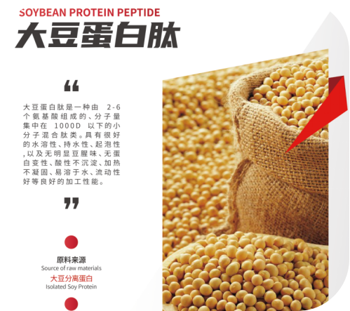 大豆蛋白肽是一种由2-6个氨基酸组成的、分子量集中在1000D以下的小分子混合肽类。具有很好的水溶性、持水性、起泡性,以及无明显豆腥味、无蛋白变性、酸性不沉淀、加热不凝固、易溶于水、流动性好等良好的加工性能。