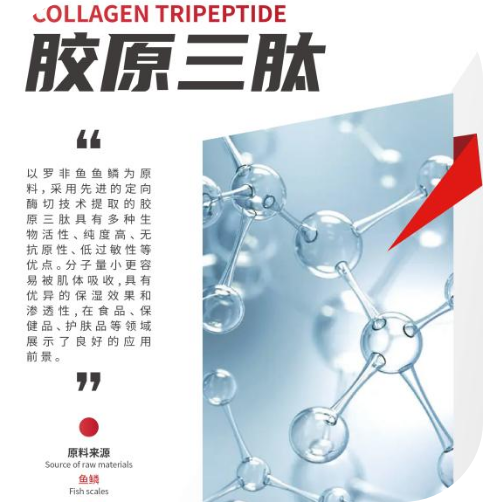 胶原三肽是以罗非鱼鱼鳞为原料,采用先进的定向酶切技术提取的胶肽具有多种生原三水物活性、纯度高、抗原性、低过敏性等优点。分子量小更容易被肌体吸收,具有优异的效果和渗透性,在食品、保健品、护肤品等领域展示了良好的应用前景。