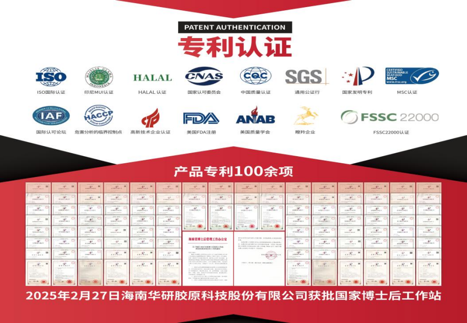 海南华研通过了美国FDA注册、印尼MUI、马来西亚HALA、犹太Kosher、ISO22000、ISO9001、ISO14001、OHSAS18001、HACCP、SGS、FSSC22000、MCS等认证,成功签约阿里国际SKA项目(海南首家阿里国际站SKA项目)……海南华研已逐步发展成为“肽领域的头部品牌”。