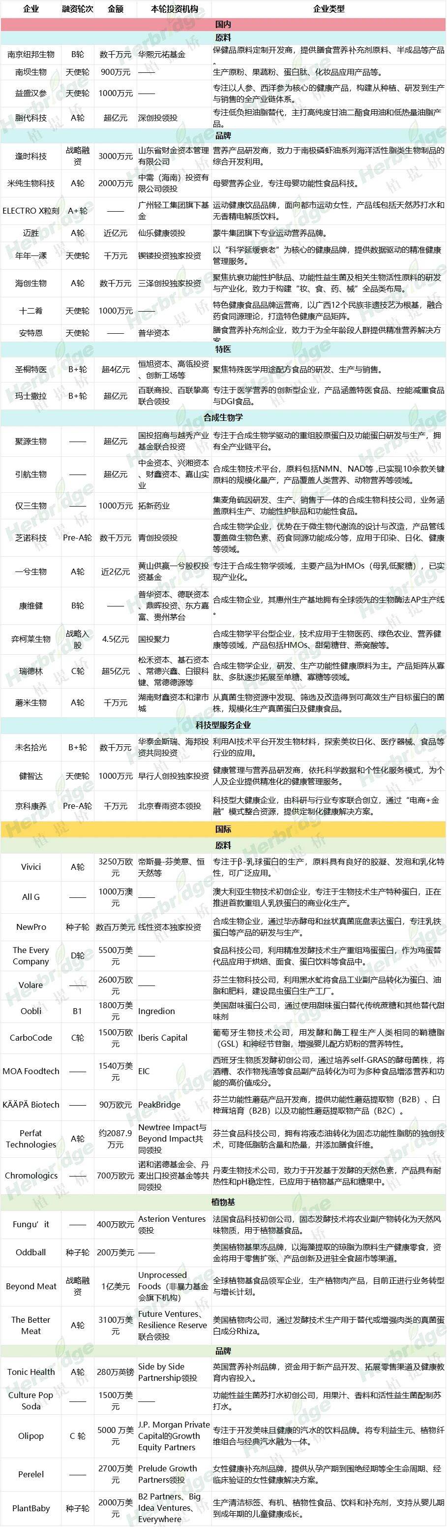 1.合成生物学依旧火热,但投资重点转向进入商业化阶段和或有极强商业化潜力的企业。经过几年的发展成熟,资本市场更倾向于“摘桃子”而非“种树”,更青睐已经迈过规模化生产门槛,进入快速商业化落地乃至可以看见变现盈利的企业,或有成功案例在前的标的。2.抗衰、运动营养的风吹向了资本市场。抗衰、运动营养不仅是营养健康产业的热点,也成为资本市场的押注热门。投资标的覆盖品牌和原料供应商。作为逆势增长的热门赛道,抗衰、运动营养在消费下行的背景下,成为了收割高端市场高利润高净值人群的关键抓手。且市场萌发刚刚开始,还有较高的增长潜力和空间,的确是增长和利润双开花的“完美标的”,但从投资标的来看,下手项目多为已经“被看见”的潜力项目,未能挖掘出新颖的潜力标的,稍显遗憾。3. 头部资方与TOP企业入局。一个明显变化来自于投资方,即头部资方和头部企业下场。头部资方如中金资本、高瓴资本、创新工厂、中金资本等,以往投资科创领域标的资本方正在将一部分资金转向营养健康产业项目。同时恒天然、帝斯曼-芬美意、诺和诺德乃至贵州茅台这样的知名头部企业,也在寻找潜力项目,意图通过投资找到第二增长曲线,不错过新的增长机遇。