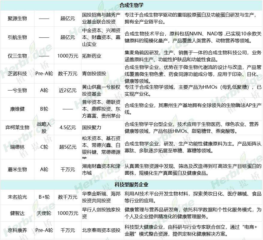 从合成生物学企业来看,资本投资的企业类型集中在2类:一类是跨过规模化生产阶段,正在走向商业化甚至已经实现了一定程度商业化的阶段;一类则是产品管线更为新颖具有潜力,或可对标成功案例。前者典型的有引航生物、仅三生物、一兮生物等;后者有聚源生物、蘑米生物这样的代表。重组胶原蛋白的火热,让相关企业在2025年备受市场关注,而基于真菌资源生产真菌蛋白则在全球资本市场十分火热,具有健康优势。