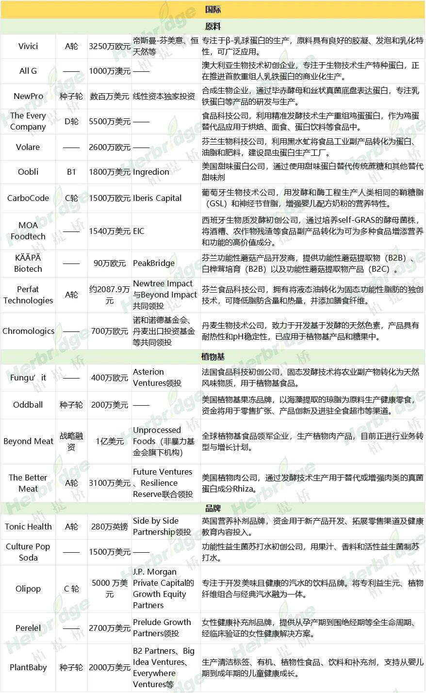 国际市场相关融资事件,据植提桥不完全统计有20起。但整体来看与往年融资热点区别不大,主要仍集中在替代蛋白、植物基方向,益生菌/益生元饮品成为了国际资方新宠。