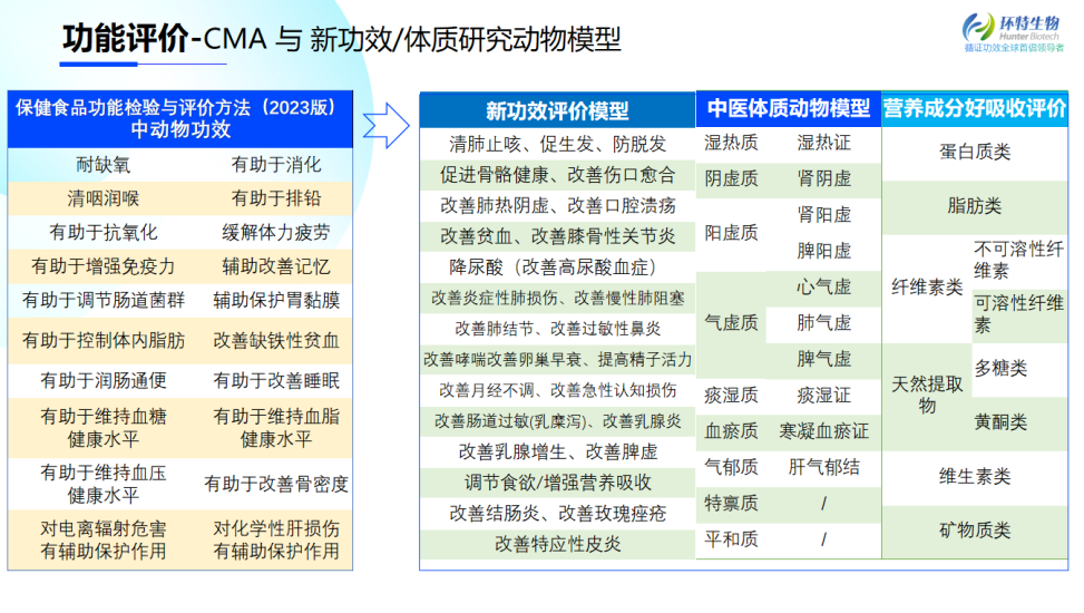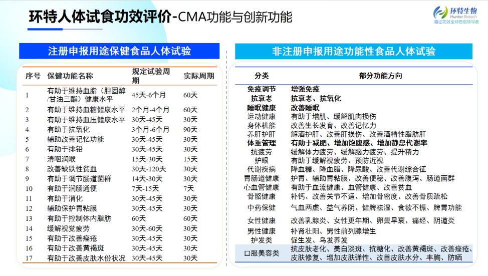 环特人体试食功效评价平台,不仅可以开展《保健食品功能检验与评价方法(2023 年版)》规定的17种常用人体试食试验,如缓解视觉疲劳、辅助改善记忆、清咽润喉、有利于控制体内脂肪、有助于调节肠道菌群、有助于润肠通便等,也可以为申报新功能的产品、口服美容产品或功能性食品开展相应的人体试食试验,如抗衰老、增强免疫、改善睡眠、解酒保肝、护发养发等,为保健食品新功能的上市后再评价、注册申报等提供强大的技术支持与科学依据。