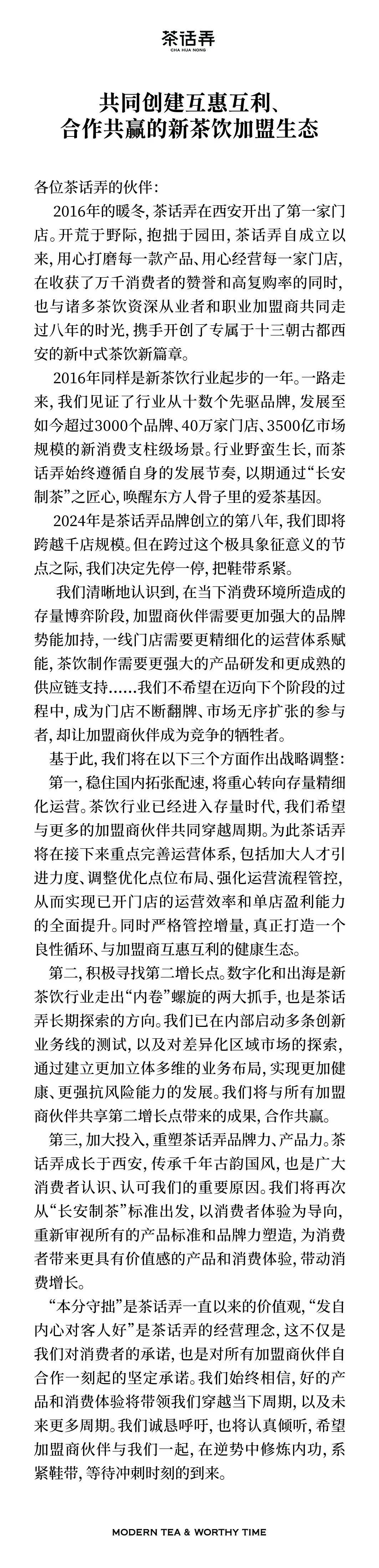 茶话弄创始人黄靖松表示,今年,随着门店数量的快速增长,组织力确实感受到了一定压力,希望借此内部信厘清发展方向,统一内部共识,和加盟商、合作伙伴打破行业内卷螺旋,实现互利共赢。