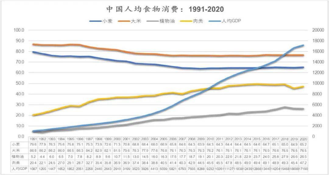 过去30年间,随着人均收入的快速增加,饮食升级趋势愈加明显:大米、小麦的人均消费量缓慢下降,而肉类和植物油则提升了数倍。