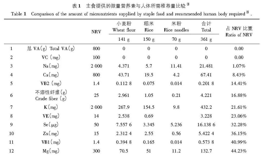 如果按照人均稻米、面粉的消费量作为每日主食的构成(将南方居民摄入量较大的米粉也计入,按照70%出粉率折算),可以看出:每日主食对于维生素和重要微量元素的贡献率明显不足。