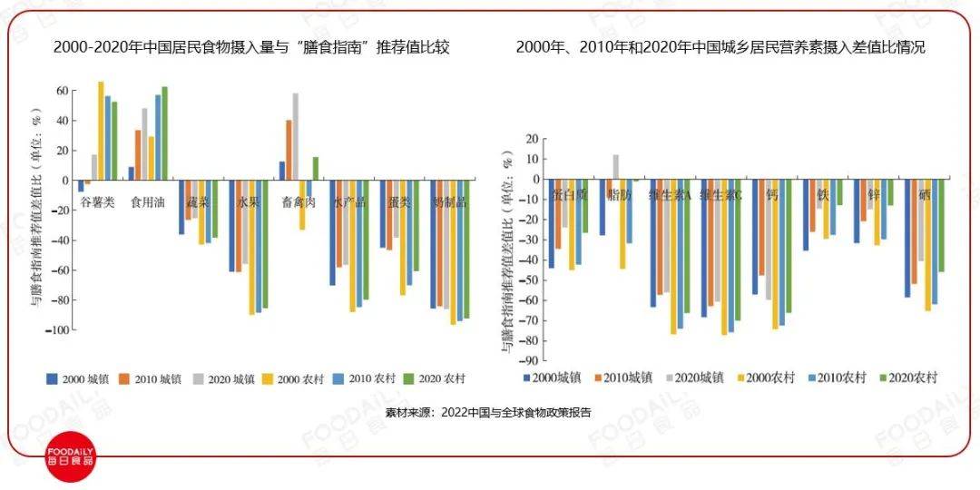 抛开这样的饮食假设,从实际的居民营养状况调查结果看,营养素缺乏也是不容忽视的社会性问题。《2022中国与全球食物政策报告》显示:2020年,城乡居民的谷物、食用油和畜禽肉摄入偏多,而果蔬、水产、蛋奶制品则偏少,导致在维生素A、维生素C、钙、硒的实际摄入量上与膳食指南推荐值相比,差距量普遍达到40%-70%,远高于蛋白质、铁和锌。