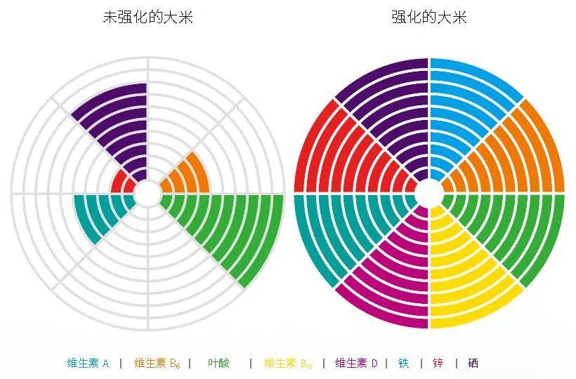 在营养元素的含量上,未强化米的维生素A、B12与D完全缺失,维生素B6、铁与锌含量也明显不足。经过强化后,5种维生素与3种重要微量元素均达到理想丰度。