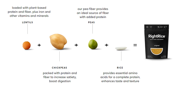 成立于2019年的美国初创品牌RightRice在创立之年推出一款颠覆性产品。以扁豆、鹰嘴豆、豌豆和不到10%的大米为原料,按照“人造米”的加工方式,将原料重塑为米饭形状。新米饭的蛋白质含量是普通米饭的两倍多,纤维含量为五倍,而净碳水化合物则减少近40%。此外,豌豆和鹰嘴豆中的B族维生素和维C、扁豆中的维生素A原,以及钾、镁、锌、钙等,也让这款组合米在微量营养素上有上佳表现。