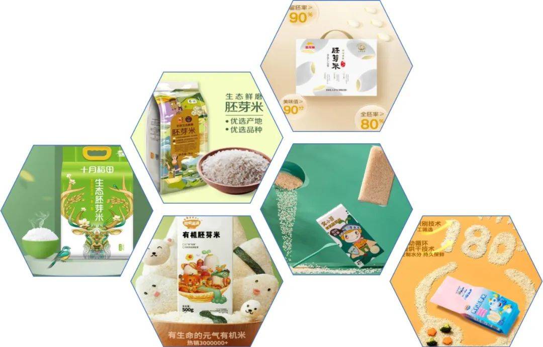 与精白米相比,胚芽米保留了富含脂肪、蛋白质及维生素的谷皮、糊粉层和胚乳,兼具良好的营养价值与口感。《2021天猫大米消费白皮书》显示,从2018-2020年,胚芽米的线上消费规模增长20倍以上,品牌数量也增加了5倍。以中粮初萃、金龙鱼、十月稻田为代表的粮油主食品牌,以及窝小芽、秋田满满、小鹿蓝蓝等儿童食品品牌,均推出了胚芽米产品。