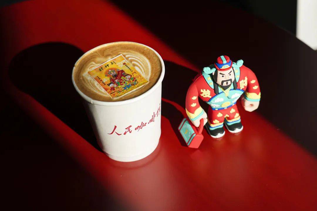 店里的招牌产品之一是“财神奶咖”,是在咖啡上附一张用糯米纸制作的财神贴画。虽然这种形式不鲜见,但出现在这家店里,就引发了较高话题度:“人民也是需要增加物质财富的,给财神咖啡点赞”。