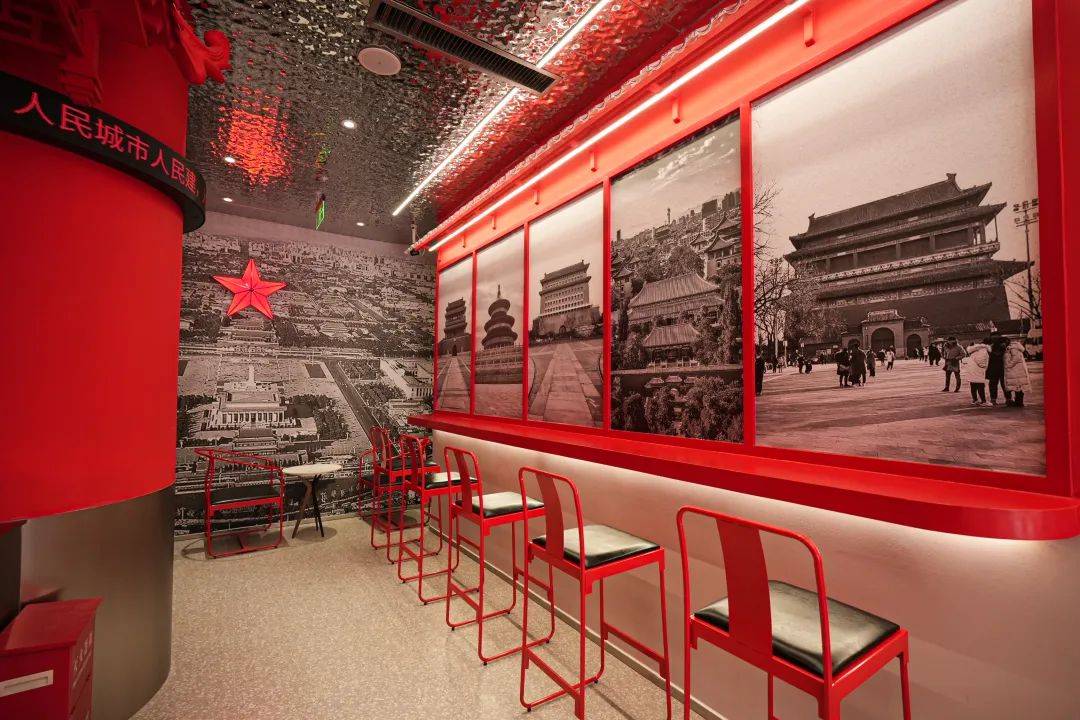 店内也充满国潮元素,黑白色的老北京城照片铺满一整面墙,正上方一颗红星熠熠生辉。天坛等北京标志性建筑也作为装饰挂在墙上。