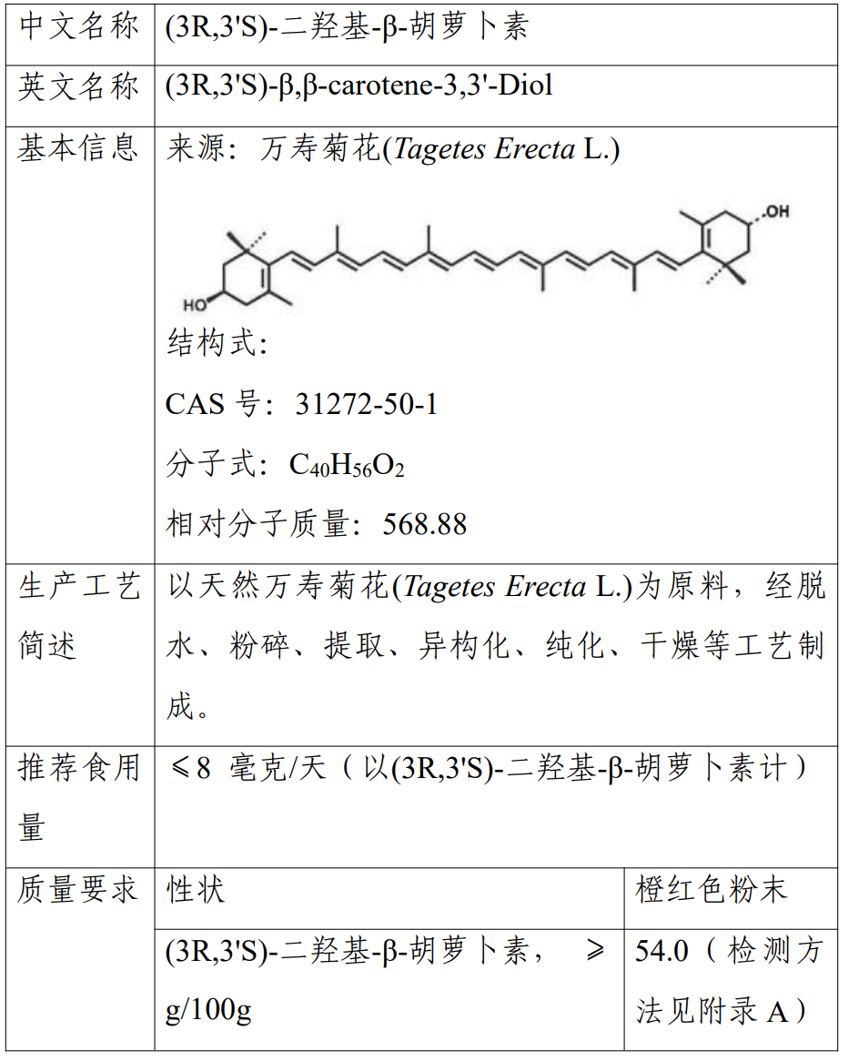 推荐食用量为:(3R,3'S)-二羟基-β-胡萝卜素含量为 54.0%的原料 推荐食用量为 8 毫克/天,超过该含量的按照实际含量折算。