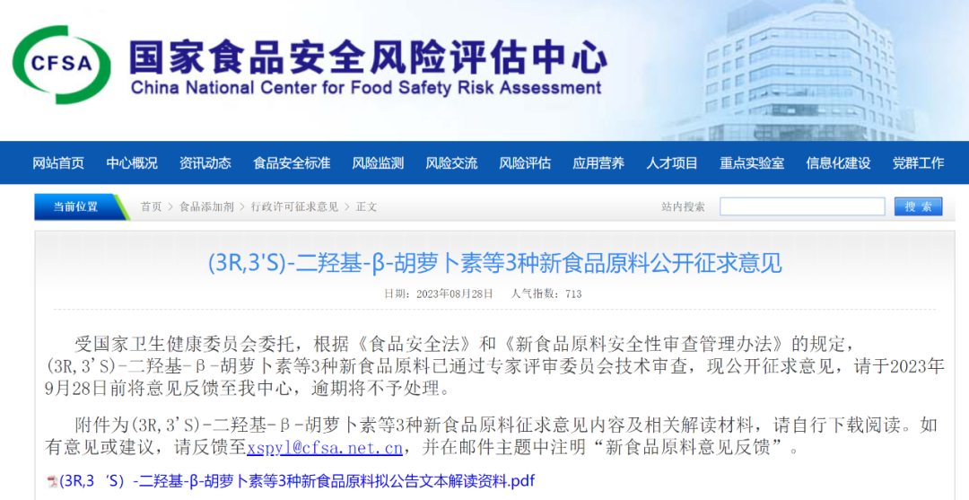 今天,国家食品安全风险评估中心发布3款新食品原料的征求意见,3款原料分别是(3R,3'S)-二羟基-β-胡萝卜素、克鲁维毕赤酵母、枯草芽孢杆菌 DE111,截至征求意见的时间为9月28日。