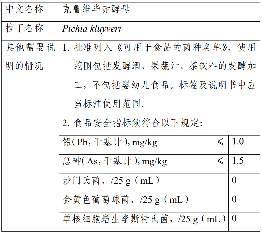 克鲁维毕赤酵母在美国被作为“一般认为安全的物质(GRAS)”管理,可作为发酵菌种用于啤酒、果蔬汁和茶等食品的发酵加工;